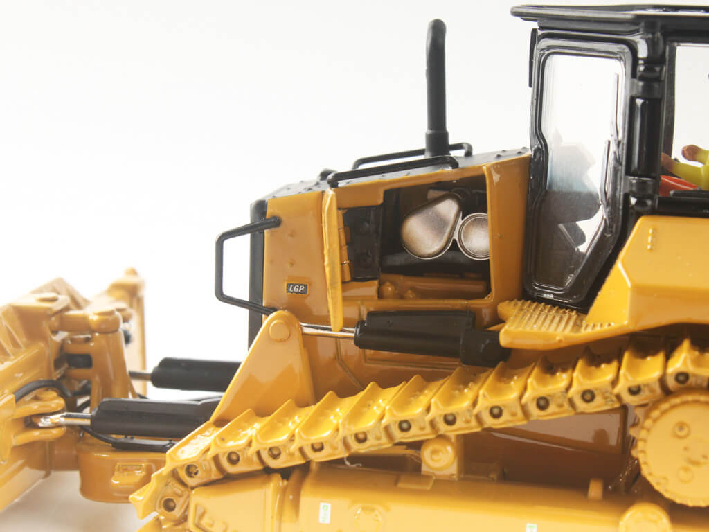 Všetky časti radlice, ripperu a podvozku sú pohyblivé tak ako na skutočnom stroji. Otváracie kapoty umožnia pohľad do motorovej časti.