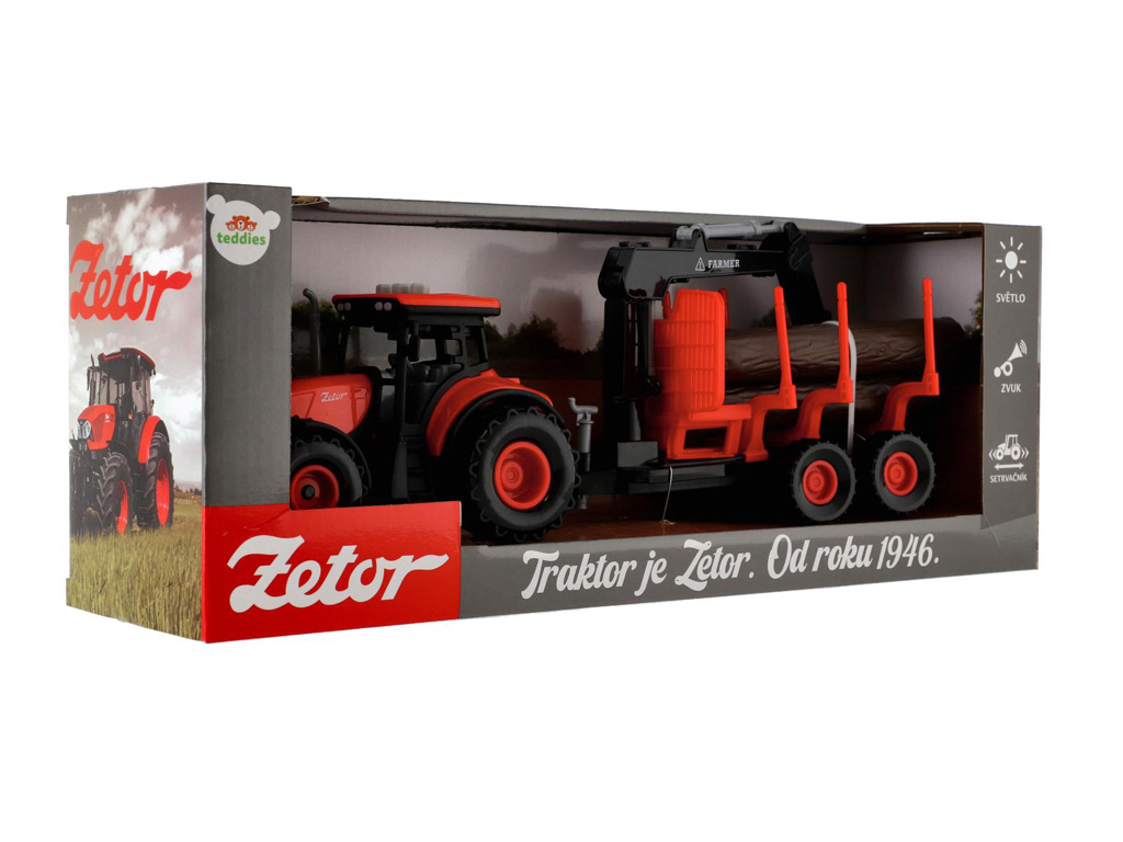 Pekná plastová hračka traktoru ZETOR s vlečkou pre malých lesníkov. Traktor s vlečkou a nákladacím ramenom je dôležitý pomocník pre každého malého lesníka! Vlečku môžeš jednoducho odpojiť a traktor využiť na ďalšie práce. Traktor jazdí na zotrvačník. Stlačením tlačidiel traktor vydáva reálne zvuky a svietia mu svetlá. Hračka od Teddies pre deti od 3 rokov je vyrobená z kvalitného plastu a pracuje na 3 batérie AG13, ktoré sú súčasťou balenia.