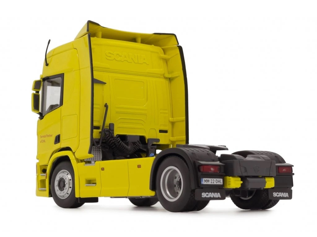 Kvalitný kovový model, detailne spracovaná kópia skutočného auta, ktorým je ťahač návesov/kamión SCANIA R500 s konfiguráciou náprav 4x2 vo farbách prepravnej spoločnosti DHL.