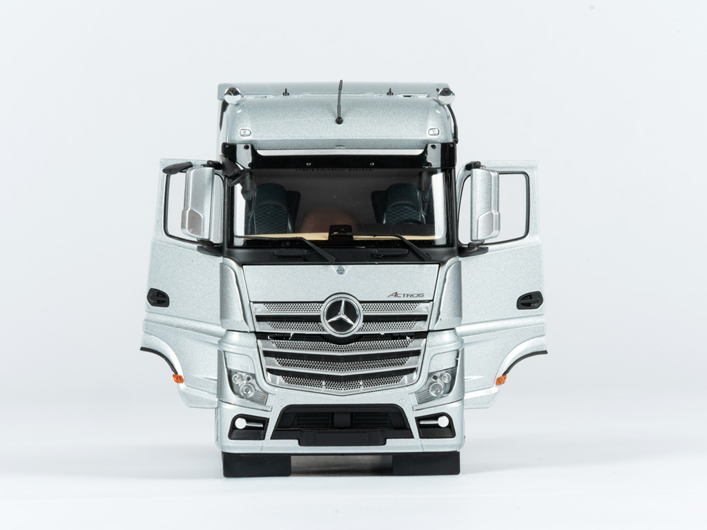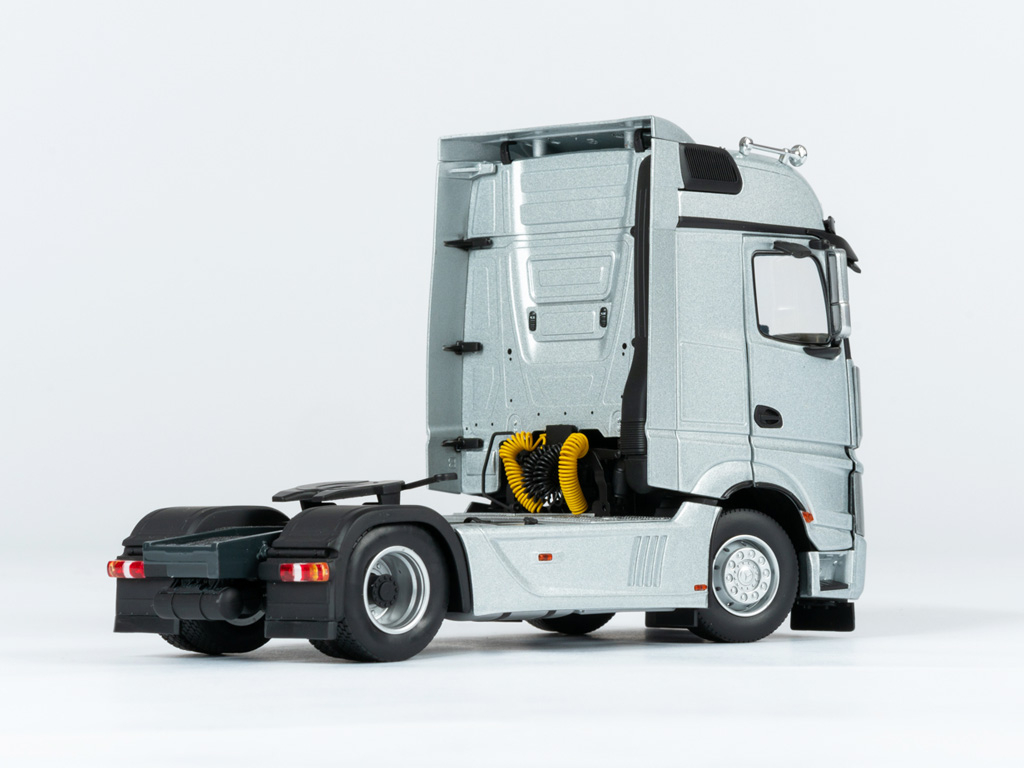 Kvalitný kovový model, detailne spracovaná kópia skutočného auta, ktorým je ťahač návesov/kamión Mercedes-Benz Actros s konfiguráciou náprav 4x2, verzia kabíny Bigspace v striebornej metalíze.