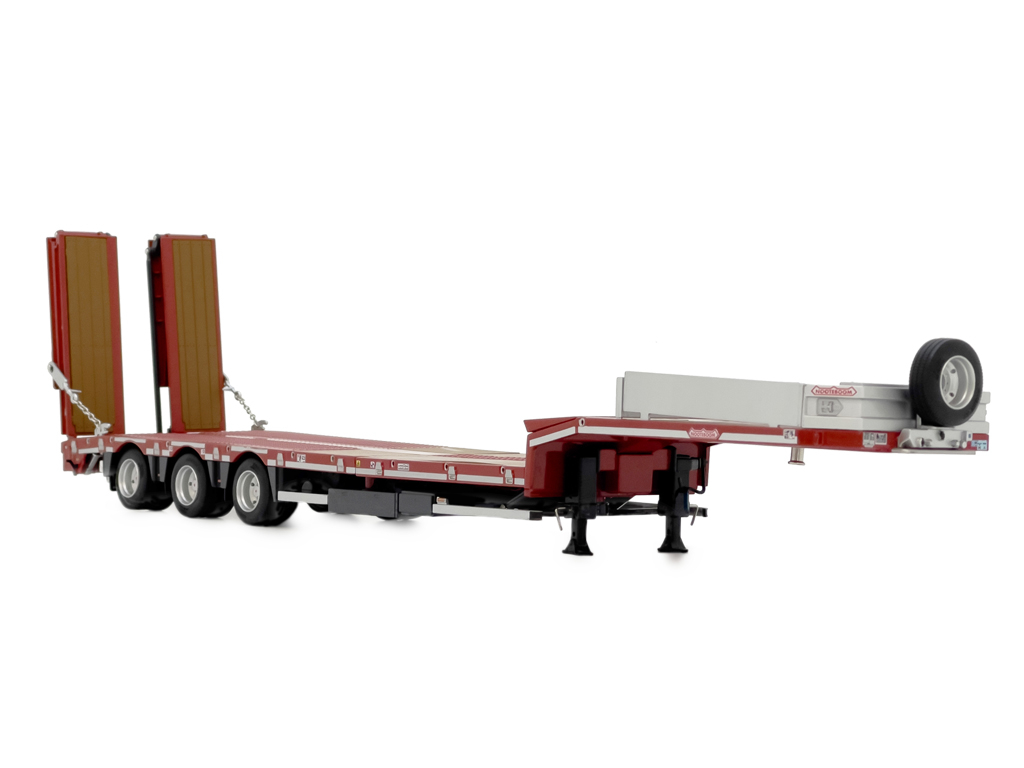 Kvalitný kovový model, detailne spracovaná kópia skutočného auta, ktorým je 3-nápravový náves, podvalník na prepravu stavebných strojov od výrobcu NOOTEBOOM.