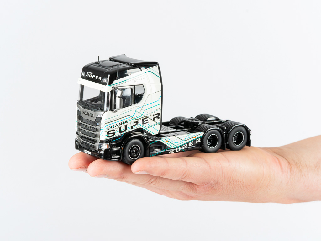 Kvalitný kovový model v mierke 1:50, detailne spracovaná kópia skutočného auta, ktorým je ťahač návesov (kamión) SCANIA Super Next Gen Highline s konfiguráciou náprav 6x2.