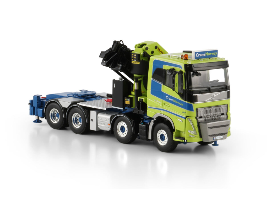 Kvalitný kovový model v mierke 1:50, detailne spracovaná kópia skutočného auta, ktorým je nákladné auto VOLVO FH5 Sleeper cab s konfiguráciou náprav 8x4 s hydraulickou rukou PALFINGER PK 92002 SH spoločnsti Crane Norway.